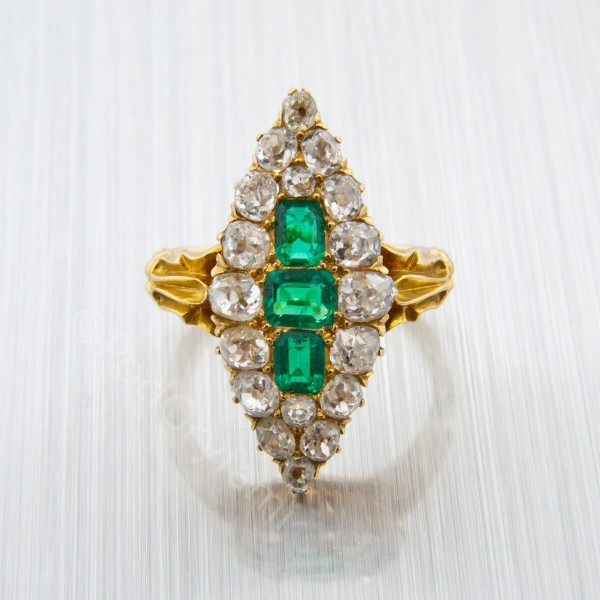 Three beautiful polished emeralds, placed among old mine cut diamonds. A lovely palm decoration in the color of sea foam.