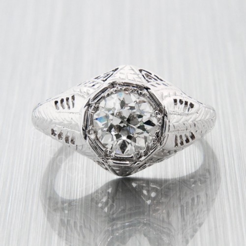Ponad karatowy diament w starym szlifie historycznym oprawiony w bogato cyzelowaną obrączkę wykonaną z białego złota.