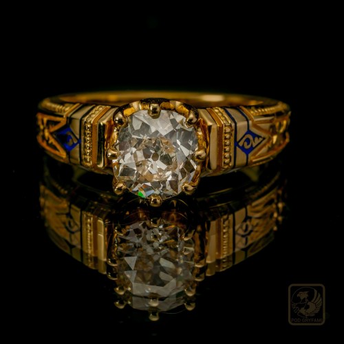 Niecodzienne połączenie ponad jedno karatowego diamentu o starym szlifie z niezwykle pięknie stylizowaną oprawą. Delikatny cyzelunek obrączki muśnięty błękitną emalią.