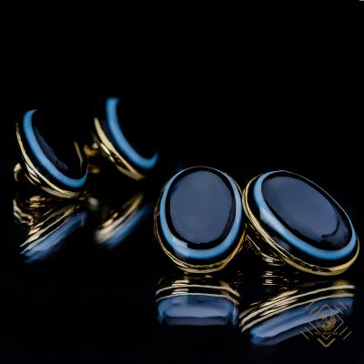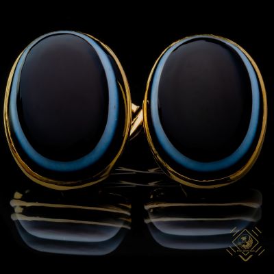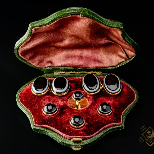 Gustowny komplet składający się ze spinek do mankietów oraz czterech guzów. Spinki ozdobione onyksami w kształcie owalnych kaboszonów. Guzy również zdobią onyksy ale w kształcie okrągłych kaboszonów. Całość umieszczona w dopasowanym zielonkawym safianowym etui wyłożonym aksamitem oraz jedwabiem w kolorze burgunda. To niewielkie jubilerskie cacko powstało na początku XX wieku i jest z pewnością ponadczasową ozdobą zarówno męskiej jak i damskiej garderoby.