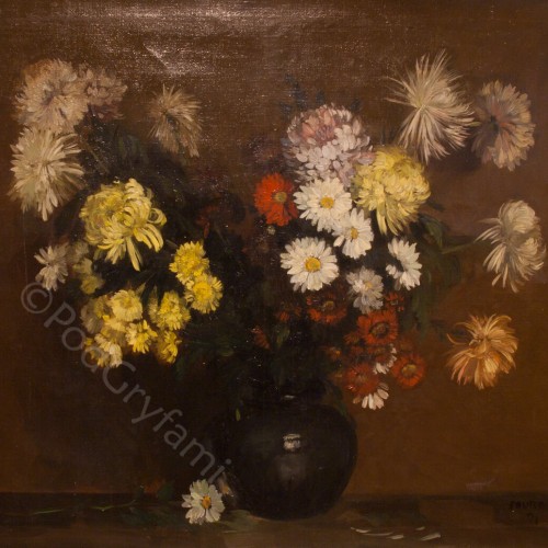 Piękna choć z pozoru mroczna praca po odpowiednim oświetleniu ukazuje niezwykłą urodę wprost pyszniących się wieloma barwami kwiatów. Ciemne tło oraz czerń wazonu doskonale kontrastują z różnymi odcieniami kilku gatunków przedstawionych chryzantem. Złociste kule, liliowe chryzantemy pierzaste oraz białe i czerwone chryzantemy drobnolistne tworzą wspaniałą kompozycję będącą ozdobą niejednego wnętrza. Sygnatura umieszczona w prawym dolnym rogu Faure 21. Płótno oraz warstwa malarska w stanie dobrym.