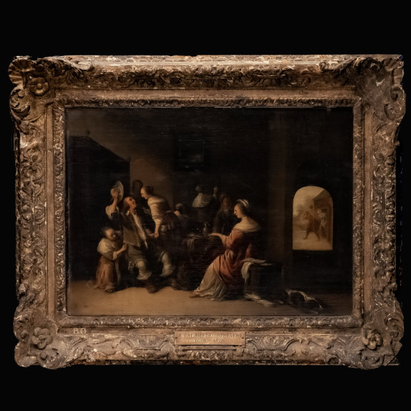 This is a wonderful example of 17th century genre painting from this artist. The work presents the interior of the guardhouse used for resting by the guard services. In the foreground, a man, probably resting on a chair after service, is shown surrounded by four young, laughing ladies. The remaining three women seem to be serving this cheerful company. Two of them, turned backwards, lock the big wooden door and another one helps to tune the instrument. Their clothing (tightly covered shoulders, modest dresses, caps covering hair) indicates that they are maidservants. The work brings with it a certain erotic subtext. A gentle caress of the hand of a woman leaning over a man, a kneeling lady helping him to take off his clothes, a slanted straitjacket, partially stretched plumes, riding boots lowered to half a calf, or a large bed with a canopy placed on the left side of the painting. Through these details, the author perfectly captured the intimacy of the characters. On the right side of the painting, as if in an open, luminous half arc of a window, we can see two more people coming out of the room. The work breathes out the elegance characteristic of Palamedesz, the figures come to life under his brush and simple gestures become somewhat sophisticated. A masterful light introducing a truly Rembrandt mood. The painting is in good condition and has been well preserved. There is a board with a visible, repaired crack at a height of 9.50 cm from the top edge leading the whole width of the painting. The signature is placed in the lower left corner, well embedded in the painting layer: "A Palamedesz." A brass plaque with the inscription A. Palamedes Stevaert 1600-1673 is mounted on the frame. The frame is in need of renovation.