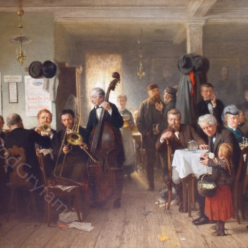 Praca jest typowym przykładem realistycznego malarstwa historycznego, które najwyższy poziom osiągnęło pod koniec XIX wieku w jakże mieszczańskich ówcześnie Niemczech. W przestronnym wnętrzu karczmy na planie równoległym zostały umieszczone dwie grupy osób. Z lewej strony oktet muzyczny umilający czas grupie mieszczan usytuowanych po stronie prawej. Nieco z przodu widzimy małą kwiaciarkę oferującą niewielkie bukieciki przebiśniegów. Z oddali wyłania się urocza karczmarka spowita delikatną poświatą dobywającą się z przysłoniętego okna. Autor z niebywałym wyczuciem uchwycił całą gamę ludzkich uczuć malujących się na twarzach biesiadników. Wielość bardzo precyzyjnie oddanych szczegółów np. niedbale rozrzucone kartki, z których niemalże możemy odczytać zapis nutowy, łeb kudłatego psiaka wyłaniający się spomiędzy nóg uczestników spotkania, łaty na spódnicy kwiaciareczki czy też detale wystroju wnętrza świadczą o wyśmienitym warsztacie malarskim i wysokim kunszcie autora. Dopełnieniem obrazu zdaje się być doskonale dobrana rama. Stan zachowania płótna oraz warstwy malarskiej dobry. Sygnatura umieszczona w lewym dole 75 C GEIBEL. Na ramie tabliczka z napisem: The Farewell Party CASIMIR GEIBEL 1839 – 1896.