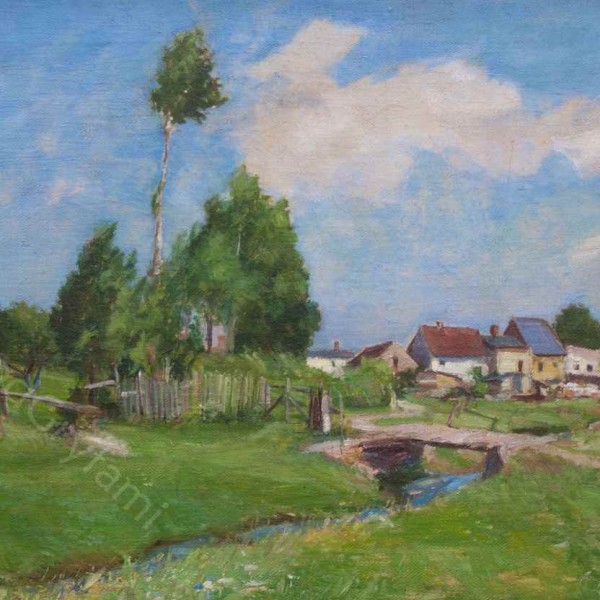 A typical Wagner landscape with the village of Wolmsdorf in the background. Wolmsdorf or Wolframsdorf was a small settlement founded in the 14th century in Lower Silesia, today it lies within the borders of Poland and is called Rogóżka. The development of the village was determined by the creation of a marble quarry in 1867 and the discovery of the "Dripstone Cave," which is characterized by its large size and rich dripstone decoration. Unfortunately, the over mining of the quarry in the 1950s led to its complete destruction. In the foreground we can see a meadow bathed in full sunlight. Here and there, delicate spots of white and blue flowers are thrown. In the distance to the right, behind a wooden bridge over a small creek, rural cottages were built under the forest. On the left, behind the palisade, a bit torn by a tooth of time, there is a fragment of an orchard with its characteristic whitewashed bark of fruit trees. Above the orchard, in a clump of wild trees, a lonely birch majestically dominates. The height of the tree introduces a note of anxiety to the harmoniously composed landscape. The cheerful composition characterized by the lushness of green-blue colors. The signature is placed in the lower right corner: "F.J. Wagner." The canvas and painting are in good condition and well preserved.