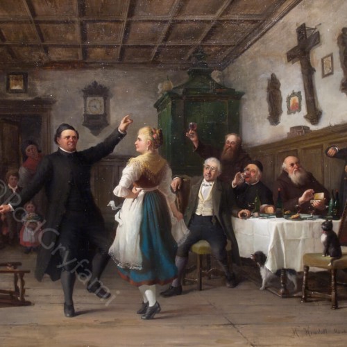 Obraz powstał w 1876 roku a więc w czasie kiedy historyzm w Niemczech wzniósł się na wyżyny sztuki malarskiej. W niewielkiej, przyciemnionej izbie widzimy ucztującą, grupkę osób. Na pierwszy plan wysuwa się tańcząca para a roześmiane twarze biesiadników wyraźnie kontrastują z surowością i prostotą wnętrza. Całość utrzymana w ciepłej kolorystyce różnych odcieni brązu złamanej bielą obrusa i przedniej części spódnicy tancerki. Niewielkie plamki nasyconej czerwieni zdają się być dopełnieniem kompozycji. Sygnatura umieszczona w prawym dolnym rogu H Hemstedt 76. Płótno w stanie dobrym odpowiednio naciągnięte na blejtram. Warstwa malarska pokryta świeżo położonym werniksem. Efektowna aczkolwiek nieprzesycona zdobieniami rama z tabliczką zawierającą napis: H.Hemsdedt 1876