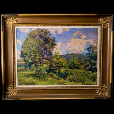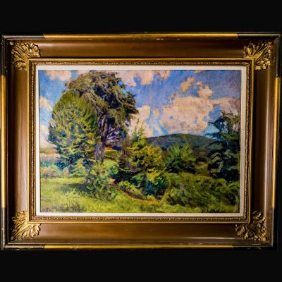 The work emanates a richness of various shades of green, which, when meeting the blue of the sky, interwoven with the white of feathery cumulus trees, creates an extraordinary spring landscape. The composition is put together with the help of large spots of colour used in the impasto technique, which proves that this is the artist's later work, in which we can see tendencies towards colour and impressionism. Without a doubt it is the signature L Misky that has been written in the lower left corner.