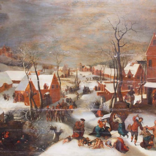 Praca w swej stylistyce i tematyce czerpie z twórczości wielkich malarzy holenderskich żyjących i tworzących w XVI wiecznych Niderlandach. Przy czym stylistycznie jest bliska twórczości Jacoba Grimmera (1525/1526 – 1590) znakomitego malarza, który całe swoje życie artystyczne był związany z Antwerpią, gdzie w 1547 roku został mistrzem gildii malarskiej. Natomiast schemat kompozycyjny obrazu wzorowany jest na jednym z dzieł najwybitniejszego malarza flamandzkiego Petera Brueghela starszego (1525/1530 – 1569). W latach 1565-67 namalował on obraz pod tym samym tytułem znajdujący się obecnie w muzeum w Wiedniu. Tematyka pracy zaczerpnięta z Nowego Testamentu z ewangelii Św Mateusza została osadzona w realiach flamandzkiej wsi przez co w podtekście nawiązuje do wydarzeń historycznych rozgrywających się w Niderlandach w okresie reformacji. Nastój kompozycji potęgowany jest dramatyczną i wyszukaną kolorystyką śnieżnobiałego krajobrazu zestawionego z ciemnymi bryłami domów i zarysami ludzkich kształtów. Poprzez drastyczność przedstawianych scen przebija jednak uduchowiony liryzm malujący się na twarzach kilku pierwszoplanowych postaci. Obraz pomimo, że nie posiada sygnatury w warstwie malarskiej, mógł zostać namalowany przez artystę pochodzącego z rodziny Petera Brueghla lub któregoś z uczniów tej znamienitej familii malarskiej. Daty umieszczone na tabliczce (1601-1678) sugerują iż mógł być to nawet wnuk Petera Brueghela starszego Jan Brueghel II młodszy(?). Niestety pozostaje to tylko w sferze domniemania. Malatura w stanie dobrym z nielicznymi ubytkami farby. Widoczne przemycia po prawej stronie środkowego pasa kompozycji. Fachowo wykonany parkietaż deski w formie zabezpieczającej kratownicy. Dobrze dopasowana rama z tabliczką z napisem: The Massacre of the Innocents Pieter Brueghel II 1601-1678