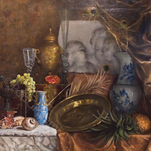 Dekoracyjny charakter harmonijnej i subtelnej kolorystycznie kompozycji podkreślają jakby nierzeczywiste wyłaniające się z drugiego planu malowane en grisaille (bezbarwnie, różnymi natężeniami szarości) główki amorków. Natomiast umiejscowione na pierwszym planie: ananas, kiść winogron, owoc granatu oraz niebywałej urody muszle morskie oddają śródziemnomorski klimat pracy. Obraz jest swoistego rodzaju rarytasem na rynku malarstwa, gdyż został namalowany w 1892 roku a więc w bardzo wczesnym okresie twórczym tego znakomitego artysty. Nigdy później jego prace nie nawiązywały w swej stylistyce do twórczości prerafaelitów chociaż w pracach symbolistów a do takich należy zaliczyć jego późniejsze dzieła można odnaleźć punkty styczne z malarstwem tej grupy artystycznej. Sygnatura umieszczona w lewym dole Sam Sarluis 1892 dobrze osadzona w warstwie malarskiej. Płótno jaki i malatura zachowane w stanie dobrym.