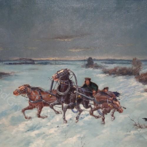 Praca zainspirowana obrazem Alfreda Wierusza-Kowalskiego pod tytułem ,,Saniami przez step”. Artysta z dużym kunsztem stworzył niezwykle kontrastowy obraz ujęty w ramy zimowego pejzażu. Z jednej strony mroźna cisza bezkresnych ukraińskich bezdroży oddająca realia odległego kraju. Z drugiej ekspresja rozbryzgujących kopytami śnieg jakby oszalałych w pędzie koni. Ta piękna o nieco nostalgicznym zabarwieniu kompozycja z pewnością będzie ozdobą niejednej kolekcji malarstwa pejzażowego. Sygnatura umieszczona w prawym dole W.Kulschinskj Mn. Płótno oraz warstwa malarska w stanie dobrym. Dobrze dobrana rama w kolorze starego złota idealnie podkreślająca śnieżną biel pejzażu.