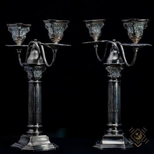 Para kandelabrów dwuramiennych z możliwością rozłożenia na dwie części i uzyskania pojedynczych lichtarzy. Podstawa w formie kolumny korynckiej. Niemieckie znaki probiercze umieszczone na krawędzi podstawy.