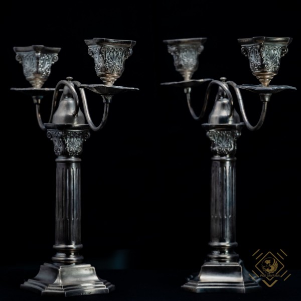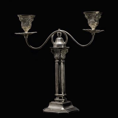 A pair of double arm candelabra with the possibility of disassembling into two parts and obtaining single candle pieces. The base in the form of a Corinthian column. German hallmarks are located on the edge of the base.
