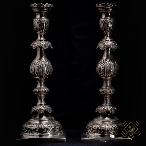 Para świeczników jedno świecowych o bogatej ornamentyce. Sygnatura jednego z dziewiętnastowiecznych warszawskich złotników B Szkarłata umieszczona na krawędzi podstawy.