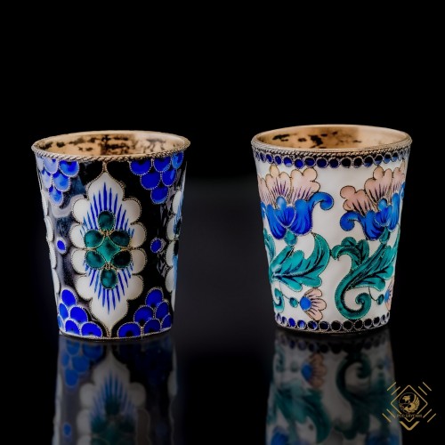 Para kieliszków wykonana ze srebra, wewnątrz złocona, ozdobiona emaliami. Kieliszki można nabyć pojedynczo.