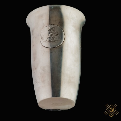 Prezentowany kubek został wykonany ze srebra. Z jednej strony umieszczono aplikację w formie tonda z popiersiem mężczyzny, z drugiej strony grawerkę w języku niemieckim. Punce : znak mistrzowski wytwórni JAL w owalu ( stosowany od 1897roku ), korona, półksiężyc - niemieckie znaki probiercze,próba srebra 800 oraz napis LEMOR BRESLAU.