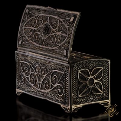 Niewielka szkatułka wykonana w srebrze techniką niezwykle misternego filigranu.