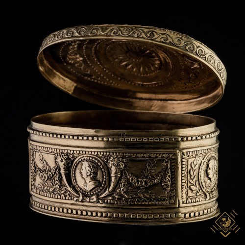 Puzderko - srebro ręcznie odlewane, repusowane, złocone , owalna forma, wieczko umocowane na zawiasie, bogato zdobione. Czara podzielona na cztery pola z wizerunkami kobiecych i męskich popiersi przedstawionych w otoczeniu kwietnych girland.