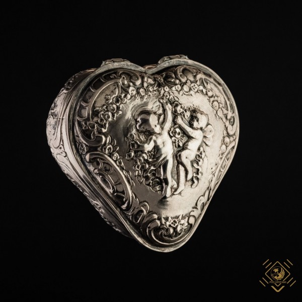 Heart shaped trinket box with a hinged cover, made in the Baroque style. The central part of the lid is decorated with two cupids. A great decoration for any woman's dressing table.