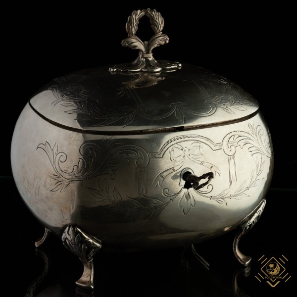 A lockable sugar bowl, decorated with Art Nouveau engraving with a floral motif. The oval shaped bowl sits on four legs. The lid is hinged, with an undecorated area left in the centre for initials or emblems. Additionally, a laurel wreath-shaped handle is attached to the lid. The initials FS (Franz Schmidt) and a hallmark are found on the inside of the lid and on the sugar bowl. The item is made of silver, and gilded inside.