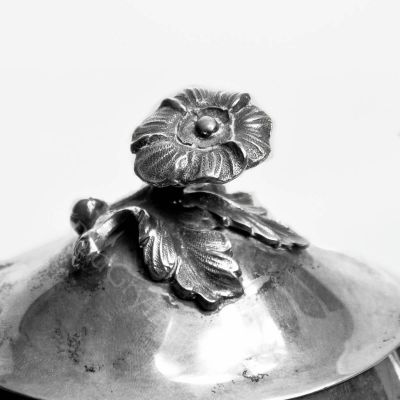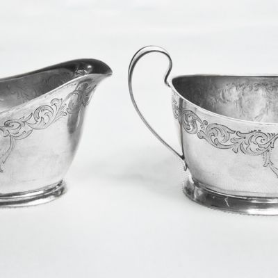 Notatka: Mlecznik: 1929 rok, Waga 102 g, Długość 10.5 cm, Szerokość 7 cm, Wysokość 6.5 cm, Cukiernica: 1929 rok, Waga 135 g, Długość 10.5 cm, Szerokość 8 cm, Wysokość 7.5 cm,