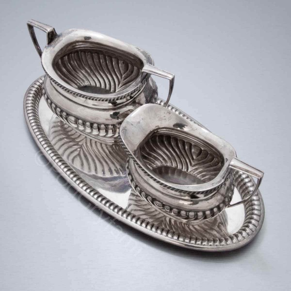 | Remarks: | Sugar bowl: Diameter 11 cm, Height 8.5 cm, Creamer: Diameter 9 cm, Height 7.5 cm, Tray: Length 25.5 cm Width 13 cm |