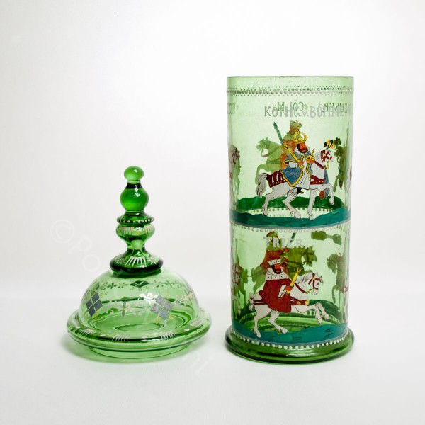 A "Kurfürstenhumpen" glass, from Germany or Bohemia, fin de siécle (after 1900), from an unknown manufacturer. Content and technique: clear glass, dyed green en masse (several air bubbles result from this method), painted with glass enamels. A cylindrical glass goblet with a flat bottom, and a domed cover with an attached multifaceted handle. On the outside of the piece, painted cut enamel decorations show men on horseback riding around on two levels. These characters are dressed in mink coats and wielding scepters in their hands. Two of the men are wearing crowns, the rest royal miters. Each of the characters has their title listed above: "König V. Böhmen / Rom. Kaiser / Coln / Sachsen / Pfalz / Brandenburg / Trier / Metz." At the top of the goblet is a border mader up of small white dots, made by machine cut into the glass.