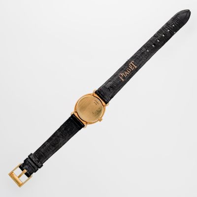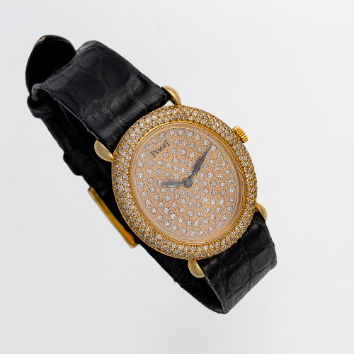 Owalny, damski, mechaniczny zegarek wykonany w złocie wysadzany diamentami. Sygnowany przez znaną markę Piaget będącą synonimem elegancji i luksusu.