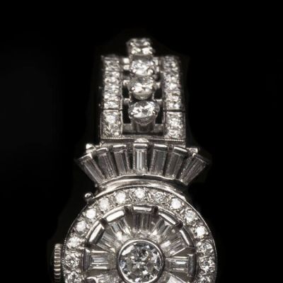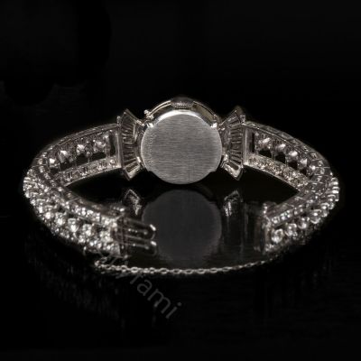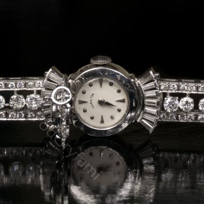 A diamond encrusted piece made of platinum combined with iridium containing the Hamilton mechanism. This rare model is decorated with about eight carat diamonds with very good parameters. The shiny wrist effect will surely satisfy diamond lovers.