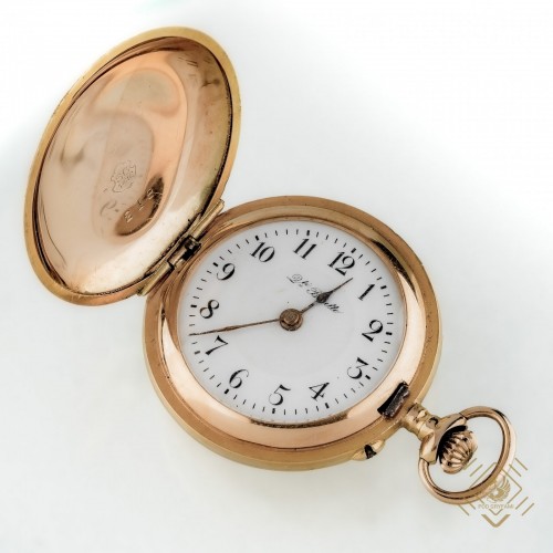 Damski, trzykopertowy zegarek kieszonkowy. Zewnętrzne koperty grawerowane i ozdobione czarnymi oraz białymi emaliami. Na tarczy lekko zatarta sygnatura marki Boutte. Zegarek wykonany z 14 karatowego złota na przełomie XIX i XX wieku z przeznaczeniem na rynek rosyjski.