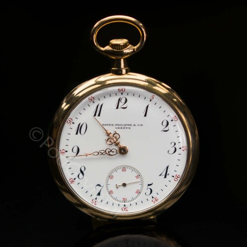Klasyczny, złoty zegarek kieszonkowy wyprodukowany przez manufakturę Patek Philippe (jedną z najbardziej prestiżowych i rozpoznawalnych firm zegarmistrzowskich). Prezentowany egzemplarz posiada mechanizm o naciągu manualnym, a kopertę wykonano z 18 karatowego złota. Jedynym mankamentem jest brak wewnętrznej koperty z numerem seryjnym. Na białej porcelanowej tarczy została umieszczona mała tarcza sekundnika, stylowe wskazówki oraz czarne cyfry arabskie.