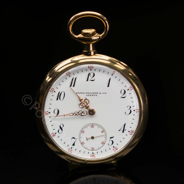 A classic gold pocket watch manufactured by Patek Philippe (one of the most prestigious and recognizable watchmaking companies). The item presented here has a manual movement mechanism and the case is made of 18 carat gold. The minor flaw is lack of an inner case with a serial number. On the white porcelain dial is a subdial for seconds, stylish batons and black Arabic numerals.