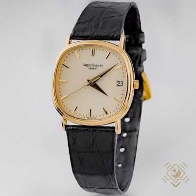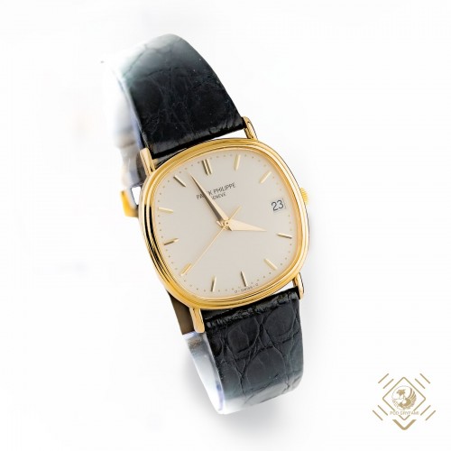 Klasyczna elipsa Patka wykonana w 18 karatowym złocie, idealna dla eleganckiego mężczyzny. Zegarek wyposażony w mechanizm o naciągu automatycznym. Na białej tarczy równomiernie rozmieszczone złote indeksy godzinowe a także umieszczone okno daty. Wskazówki proste, złote z centralnym sekundnikiem. W górnej części cyferblatu sygnatura Patek Philippe Geneve.