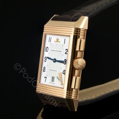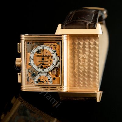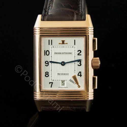 Jaeger LeCoultre – symbol wyrafinowanego stylu jak również synonim luksusu i prestiżu. Kolekcja Reverso jest flagowym produktem szwajcarskiej manufaktury zegarmistrzowskiej Jaeger LeCoultre. Prezentowany egzemplarz jest wyjątkowym i ekskluzywnym zegarkiem męskim. Świadczy o tym fakt, że został wyprodukowany w limitowanej serii 500 sztuk (w 1996r.) i oznaczony nr 160. Do jego wykonania posłużyło 18 karatowe różowe złoto. Posiada również chronograf i datownik. Dodatkowym atutem tego zegarka, a także cechą najbardziej rozpoznawalną jest obracana koperta, która zapobiega mechanicznym uszkodzeniom szkiełka.