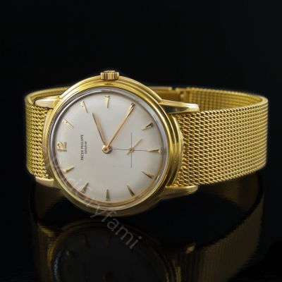 Klasyczny, naręczny zegarek męski, wyprodukowany w latach 50 – tych XX w. (ok. 1958) Do jego wykonania wykorzystano 18 karatowe złoto. Pleciona bransoleta, typowe wskazówki oraz złote indeksy godzinowe, idealnie współgrają ze srebrną tarczą, na której został umieszczony sekundnik.Model posiada naciąg szwajcarski mechaniczny.Sygnatura Patek Philippe Geneve umieszczona na cyferblacie.