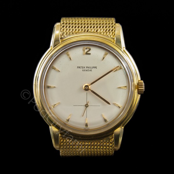 A classic wristwatch for men, made in the 1930s and 1950s. (ca. 1958) 18 carat gold was used to make it. Chainmail bracelet, typical hands and golden batons perfectly match the silver dial on which the seconds hand is placed. The model is equipped with Swiss mechanical movement.