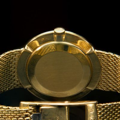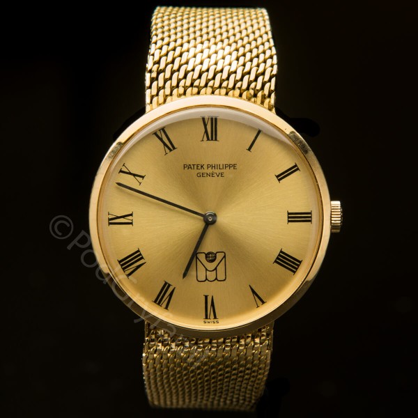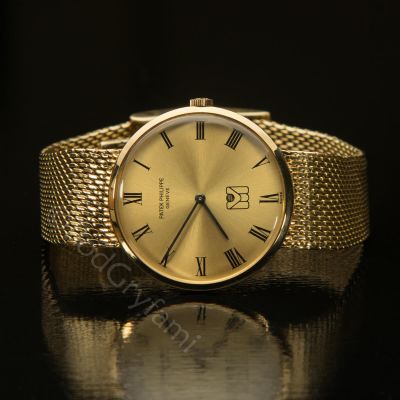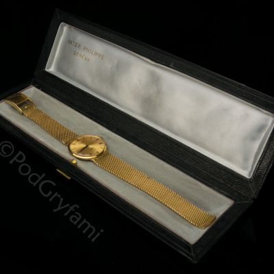 Beautiful 18K gold wristwatch with bracelet. Made in 1971 by Patek Philippe. The champagne-colored dial with radially arranged Roman numerals will appeal to many elegant men.