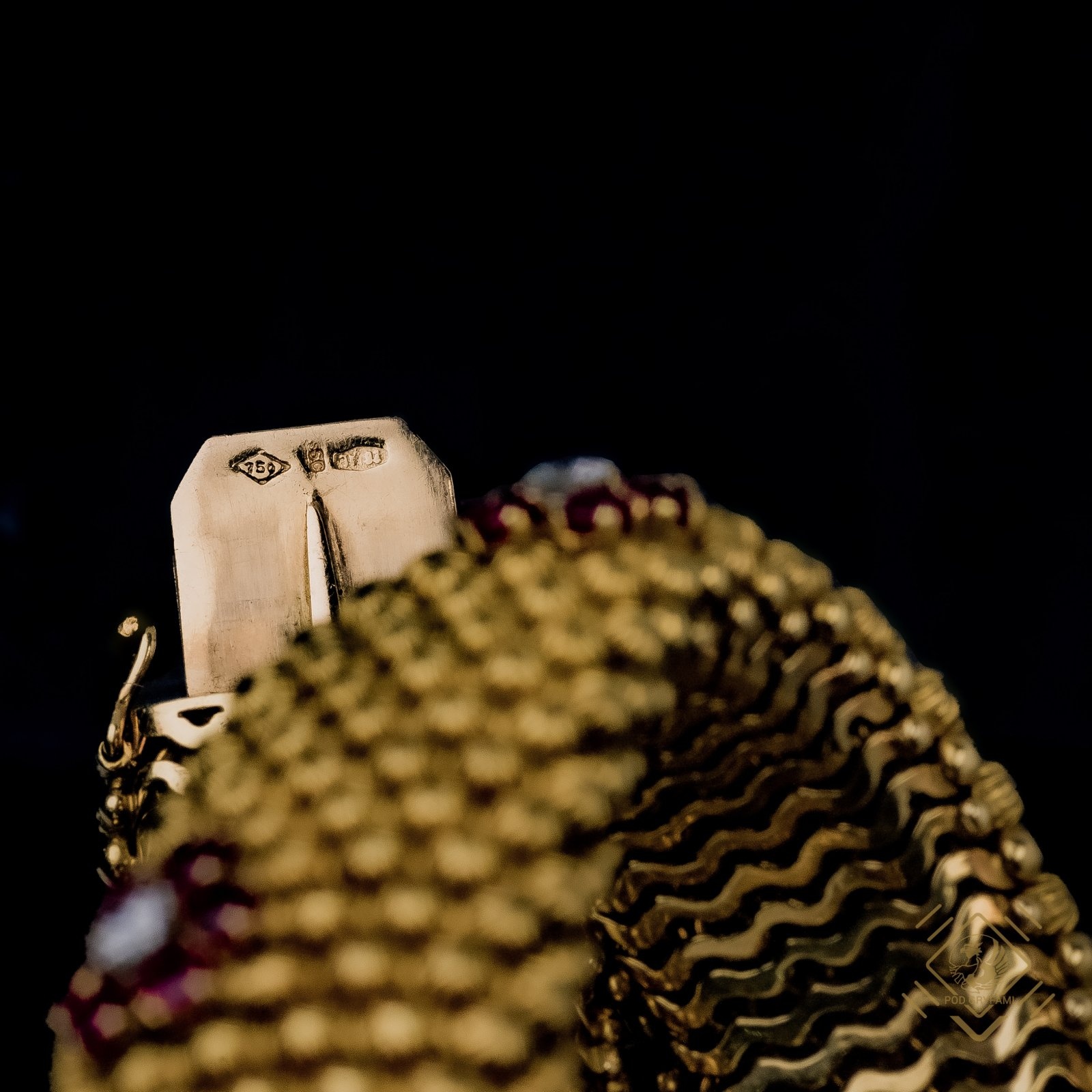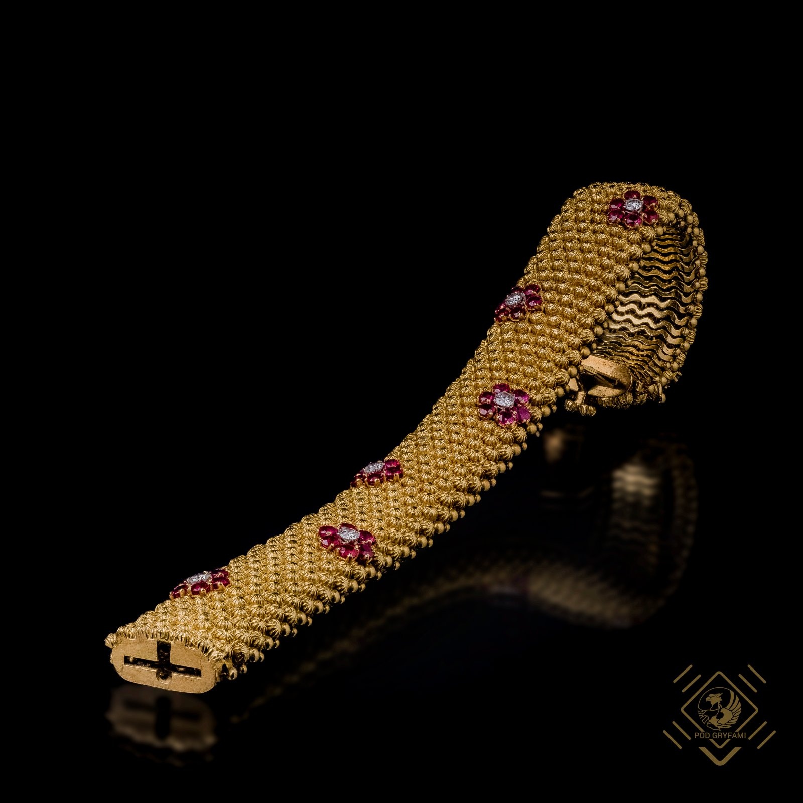 Bransoletka o rzadkim, bardzo ciekawym splocie. Ozdobiona drobnymi kwiatkami, kameryzowanymi diamentami - środki kwiatów i rubinami - płatki kwiatów. Miękko układa się na na nadgarstku, nadając mu elegancki wygląd. Niewątpliwe piękno w połączeniu z sygnaturą włoskich mistrzów jubilerstwa sprawia, że klejnot jest absolutnie wyjątkowy i niepowtarzalny.