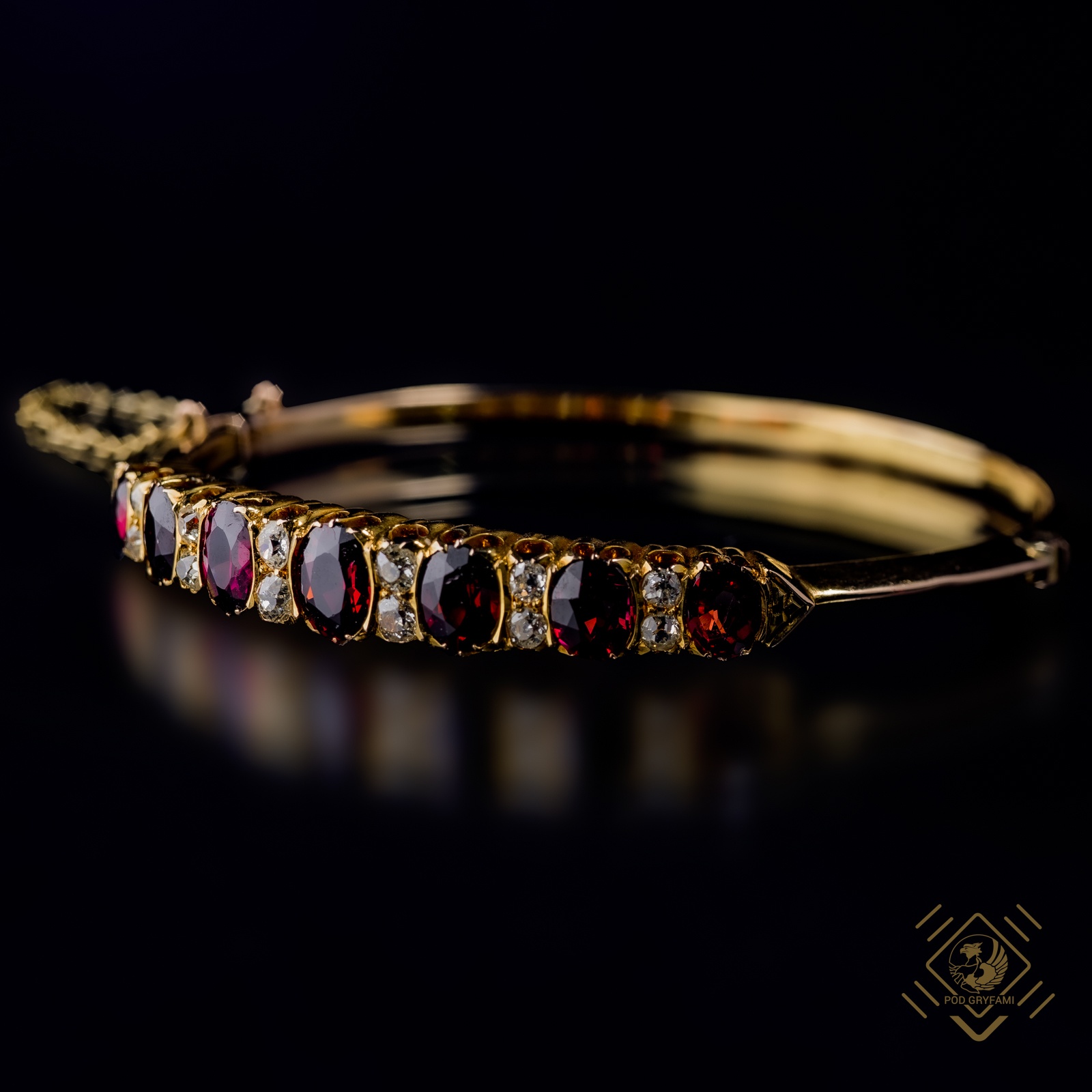 Prosta forma złożona z dwóch półobręczy połączonych zawiasem doskonale koresponduje z diamentami i granatami. Idealnie dobrane diamenty tworzą delikatną poświatę dla podkreślenia karminowoczerwonej barwy piropów minerałów należących do grupy granatów.
