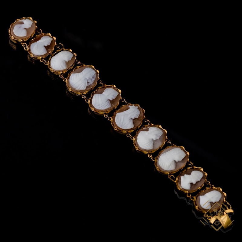 This magnificent bracelet with cameos made of seashells (Conchifera) framed in gilded metal with a cleverly finished clasp gives the impression that the jewel has no beginning or end. Among the ten images made in the shell, one depicts the face of Queen Victoria.