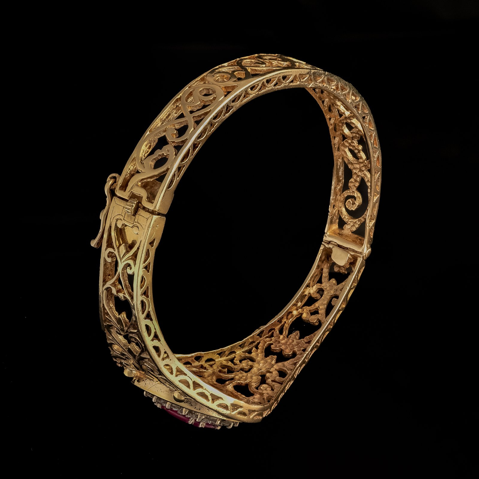 Bogato zdobiona ażurowa konstrukcja złożona z dwóch półobręczy połączonych zawiasem. W centralnej części w formie karmazycji osadzony rubin w diamentowym towarzystwie. Wspaniały blask diamentów doskonale podkreśla intensywną, głęboką amarantową barwę delikatnie fasetowanego korundu. Kunsztowna, ręczna praca złotnicza.