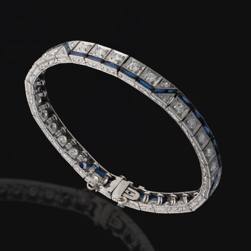 Prosta segmentowa wykonana z platyny konstrukcja. Wspaniałe połączenie kanałowo oprawionych diamentów z ciemnobłękitnymi szafirami w szlifie bagiet. Niezwykle wdzięczna, kobieca forma zdobiona techniką rytowania i millegrainu.