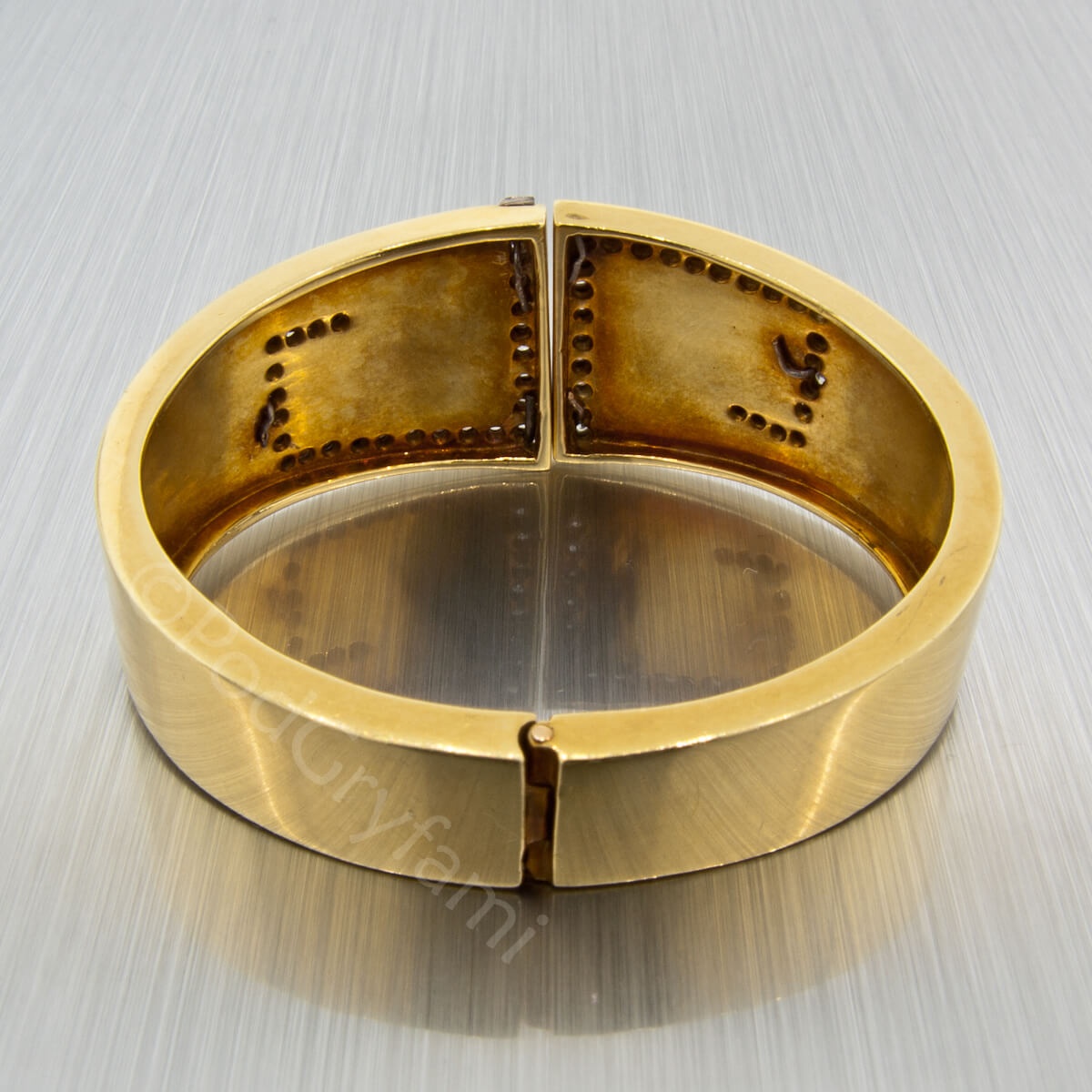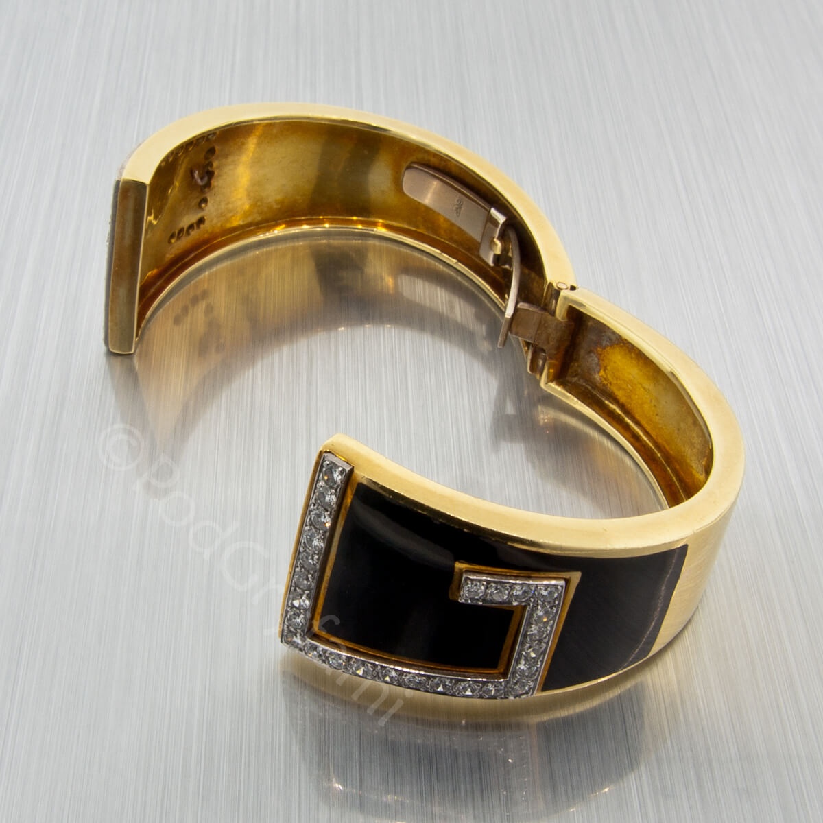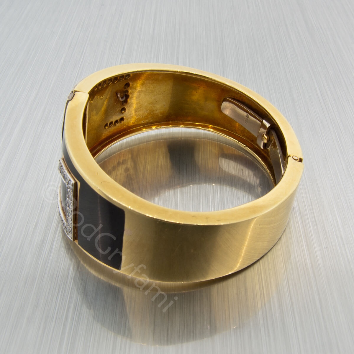 Klasyczne geometryzujące Art Deco. Wspaniała złota konstrukcja oparta na specjalnym zawiasie umożliwiającym otwieranie z przodu doskonale dopasowana do przegubu dłoni. Front dekorowany czarną emalią oraz kanałowo osadzonymi diamentami.