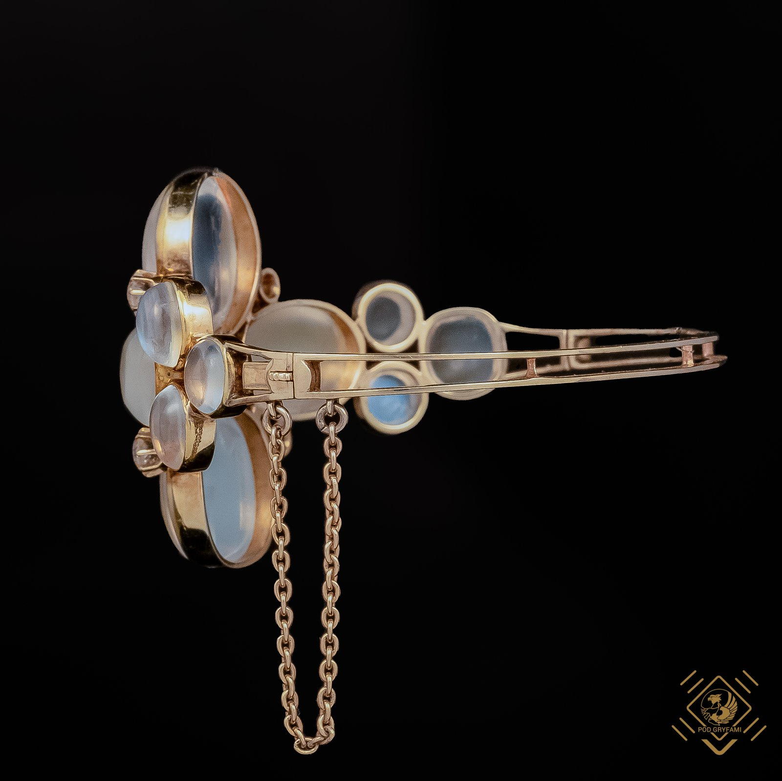 Bransoleta wykonana na przełomie XIX i XX wieku. Artysta - złotnik projektując klejnot posłużył się dekoracyjnym, geometrycznym wzorem architektonicznym zwanym maswerkiem. W delikatnej złotej oprawie zostały ujęte przepiękne, szlifowane w kaboszon kamienie księżycowe. Kamienie te są odmianą minerału zwanego ortoklazem i charakteryzują się specyficznym zjawiskiem świetlnym w postaci niebiesko połyskującego pasemka, które przesuwa się przy poruszaniu kamieniem. Dodatkowo bransoletę zdobią naturalne cztery białe i jeden niebieski szafir. Zapięcie zabezpieczone łańcuszkiem. Z pewnością jest to klejnot dla damy o bardzo wyrafinowanym guście.