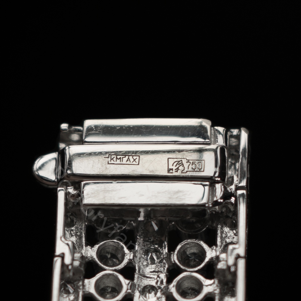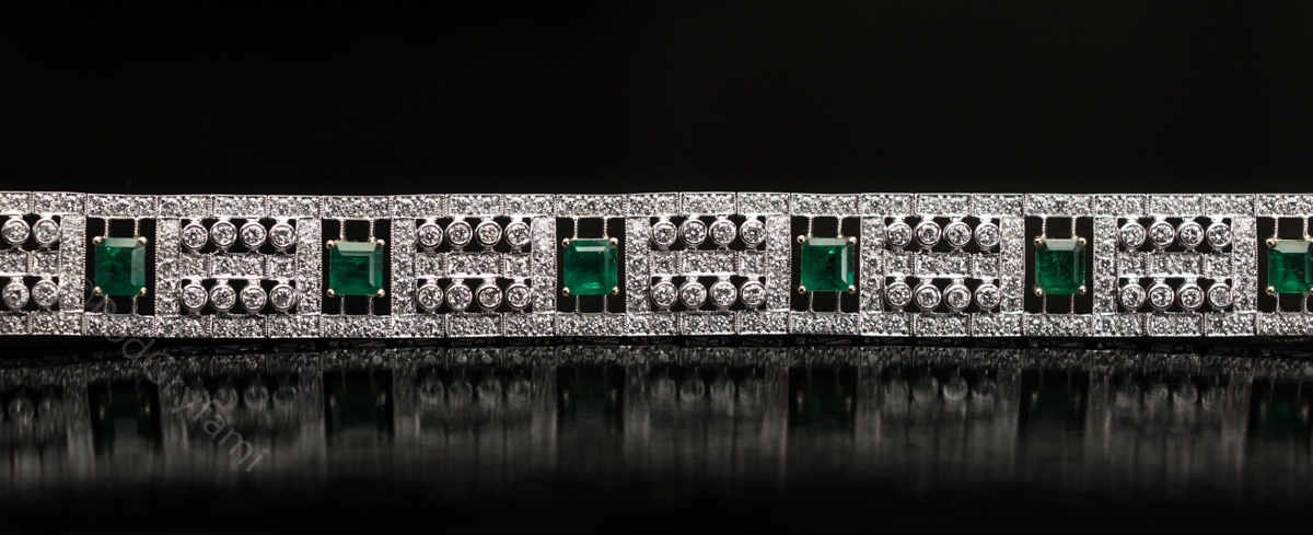 Bransoleta swoim geometrycznym kształtem nawiązuje do stylizacji Art Deco. Wykonana z 18 karatowego białego złota ozdobiona diamentami oraz idealnie dobranymi niewielkimi szmaragdami o ciemnozielonej barwie. Cenny klejnot doskonale układający się na przegubie kobiecej dłoni.