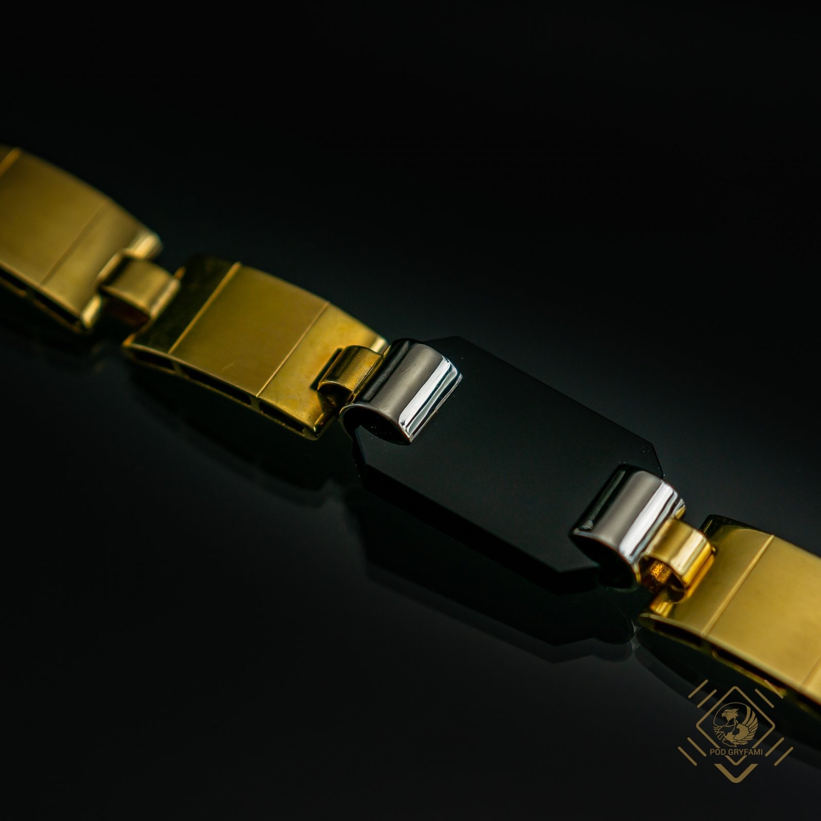 Wyrafinowany styl Art Deco niepodzielnie króluje od 1925 roku a więc od czasu słynnej paryskiej wystawy, chociaż precjoza w tej estetyce występowały już od 1915 roku. Prezentowana bransoleta powstała właśnie około 1925 roku. Jej piękną geometryczną formę podkreślają ośmiokątne onyksy przeplatane białym i żółtym złotem. Pięknie układająca się na przegubie dłoni bransoleta stanowi również zabytek epoki Art Deco.