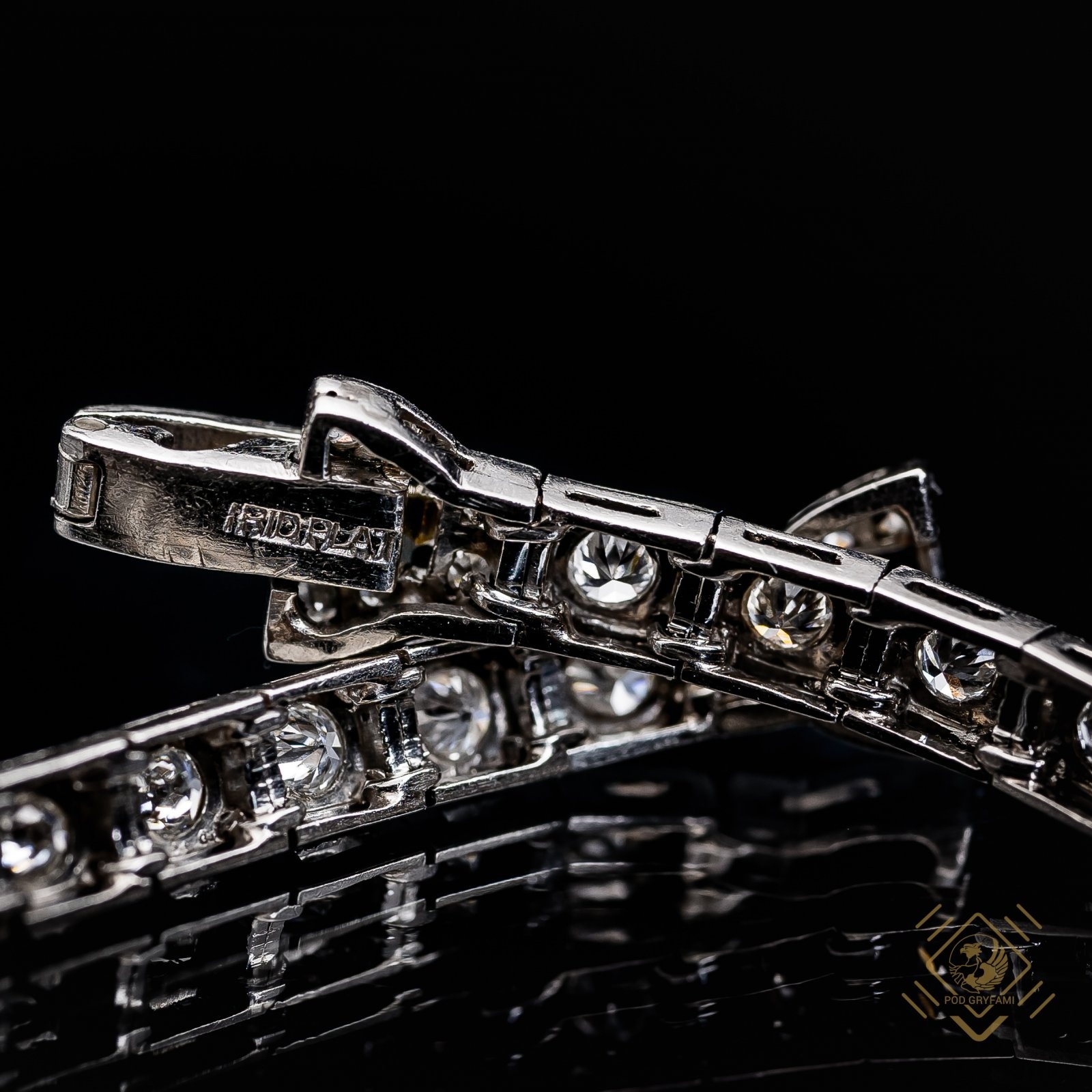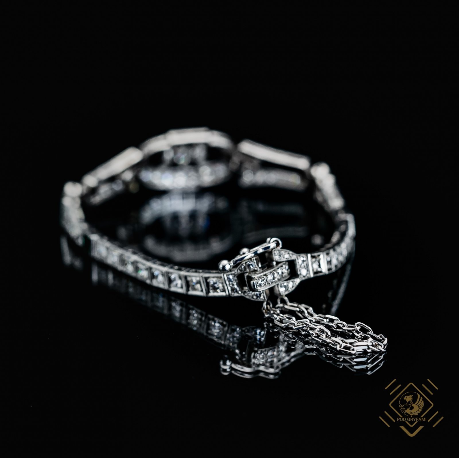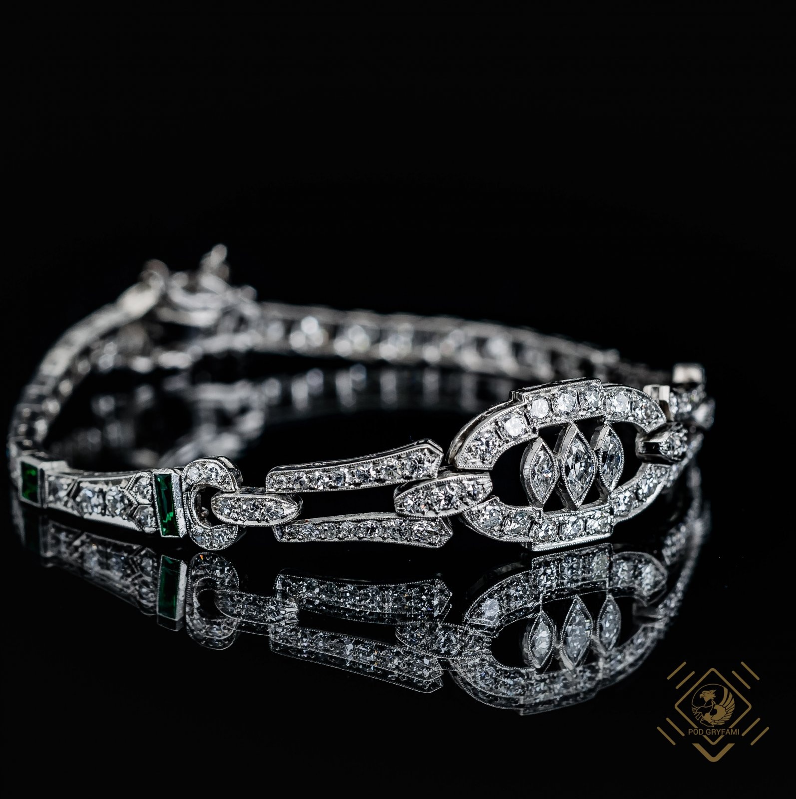 Jeden z piękniejszych przykładów klasycznego Art Deco. Idealnie dobrane diamenty połączone z delikatnie połyskującą bielą platyny ujęte w różnorodne geometryczne wzory doskonale odzwierciedlają klimat i szarm minionej epoki. Precyzja wykonania oraz niebywały kunszt złotnika znakomicie podkreślają urodę klejnotu.