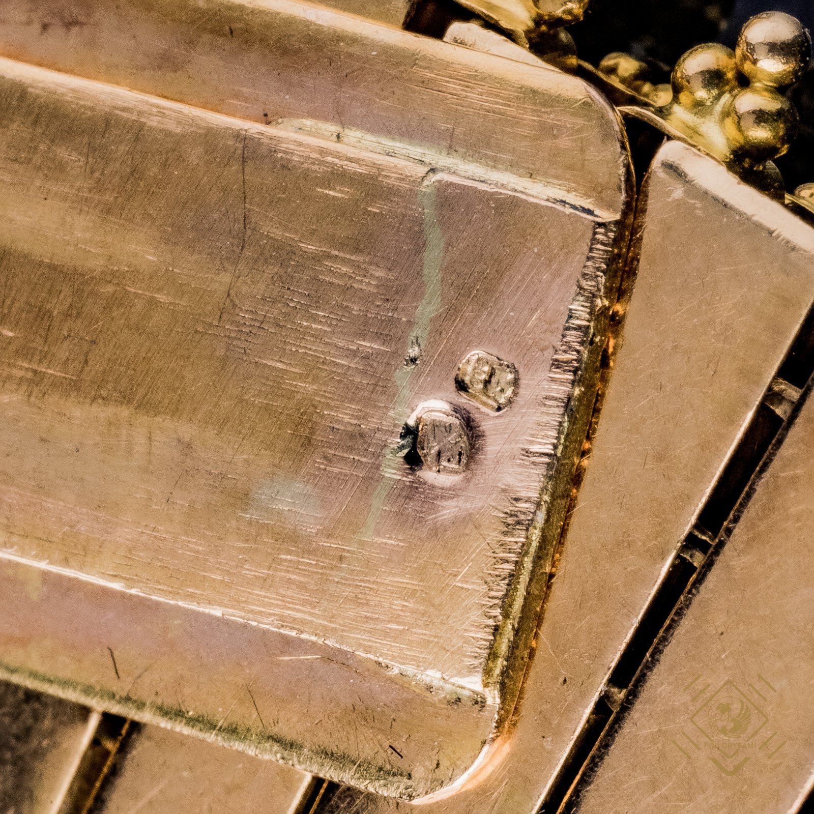 Maestria pracy jubilerskiej z pierwszej połowy XX wieku opieczętowana portugalskimi znakami probierczymi. Bransoleta o bardzo rzadko spotykanym splocie wykonana z dwubarwnego ponad 18-karatowego złota. Efektowne zapięcie w formie podzielonego na ćwiartki kwadratu. Każda ćwiartka zdobiona techniką millegrainu oraz niewielkim turkusem. Dodatkowym atutem jest łańcuszek zabezpieczający zapięcie.