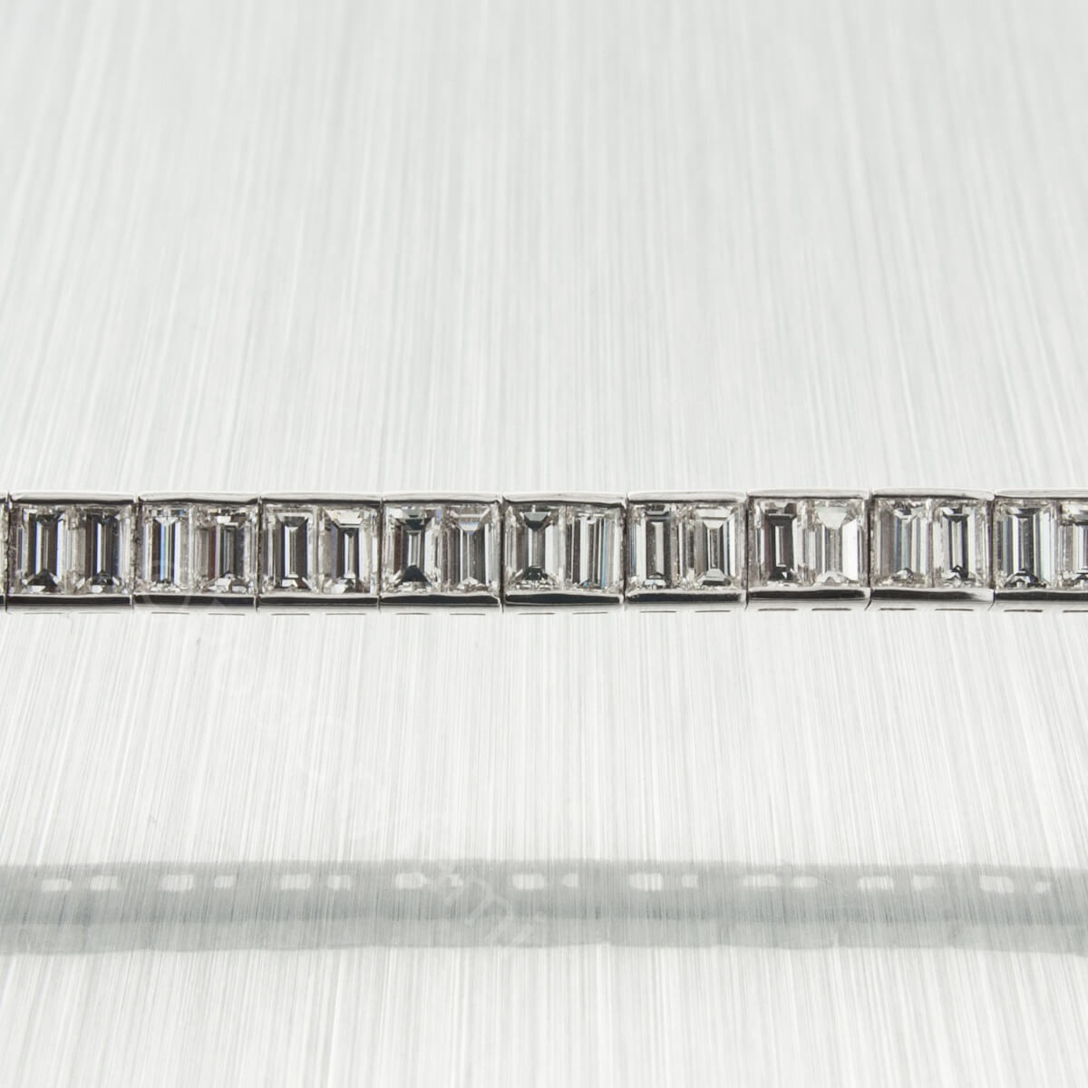 Doskonały przykład bransolety ,,tenisowej" gdzie w symetrycznym szeregu oprawione w białe złoto połyskują diamenty o szlifie bagiet. Bransolety tenisowe są niezwykle popularne dzięki uczestniczkom turniejów tenisowych Sereny Williams, Gabrieli Sabatini, czy też Chris Evert, dzięki, której zawdzięczają swą nazwę. Wspaniała ozdoba kobiecej dłoni na co dzień i na wyjście.