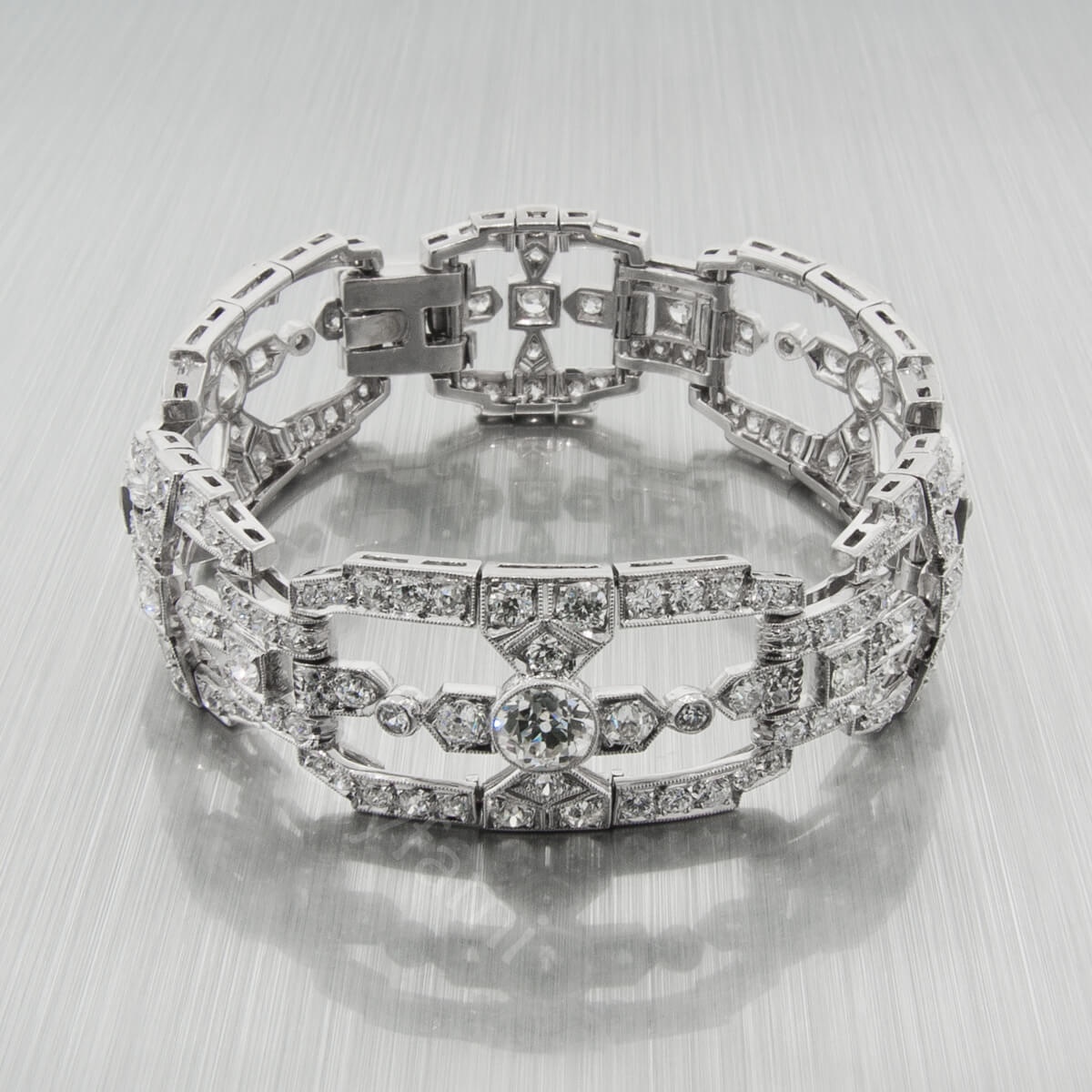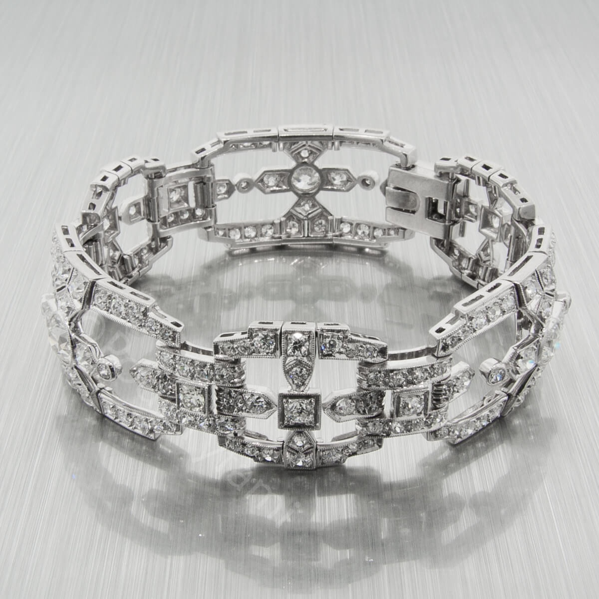 Cudowne lata 20-te, 30-te XX wieku , zachowana czysta forma Art Deco z nutą symetrii. Imponująca platynowa konstrukcja mocowana na zawiasach z bezpiecznym niemalże niewidocznym zapięciem. Majstersztyk ręcznej pracy złotniczej dekorowany diamentami w historycznych szlifach old european cut.