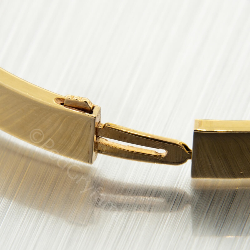 A charming piece for its stunning simplicity, signed by goldsmith Daniel S. Rine! The bracelet was created in the twentieth century and is distinguished not only by an interesting clasp, but above all by the extraordinary beauty of its simple classic form. The completely smooth rim is decorated with small diamonds and interestingly polished rubles, and will not only be a perfect complement to an evening outfit, but also a decoration for an everyday elegant outfit.