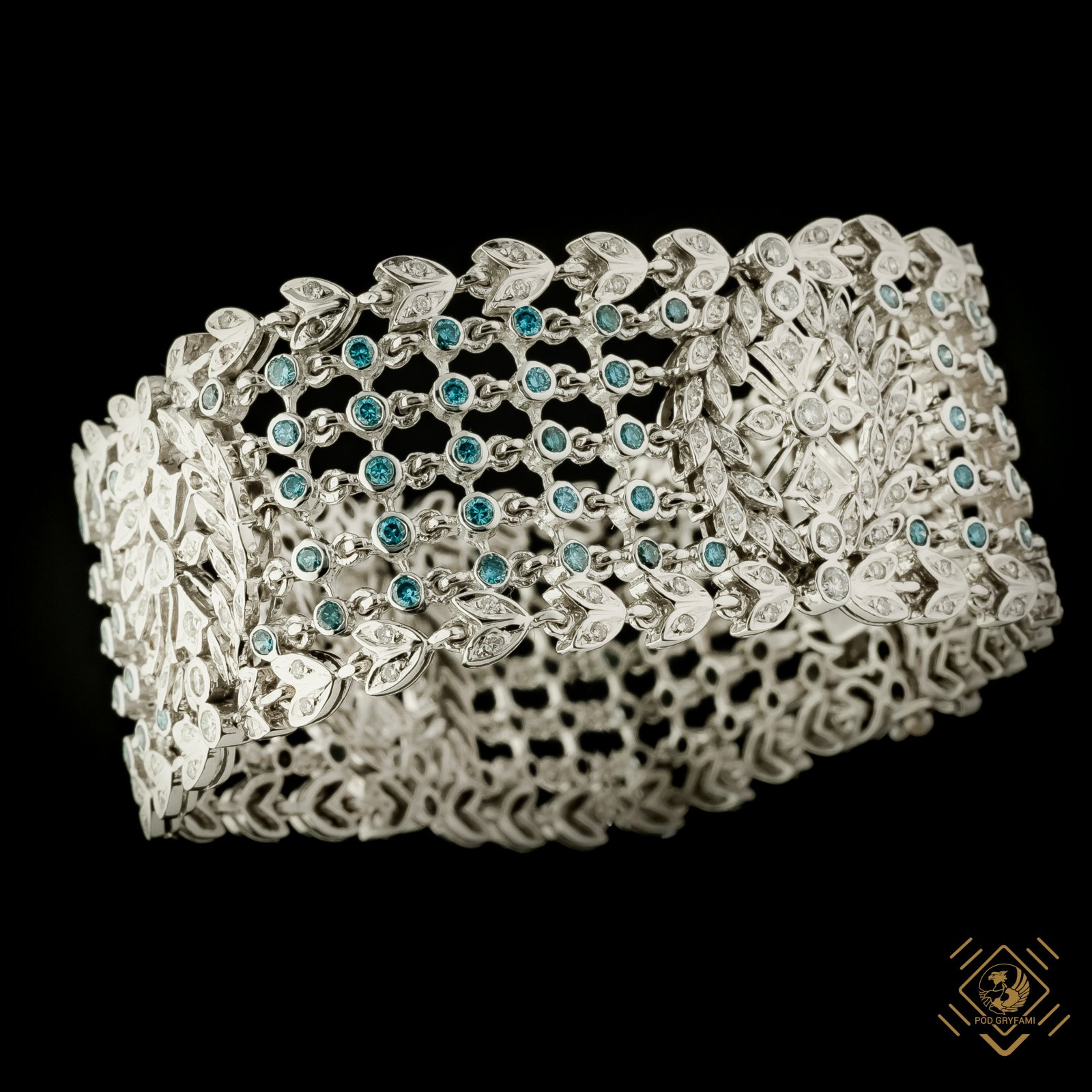 Klejnot powstał w XX wieku i stanowi doskonały przykład niezwykłego kunsztu mistrzów złotnictwa. Delikatna siateczkowa konstrukcja ozdobiona motywem liści laurowych. Całość kameryzowana diamentami w dwóch barwach bieli oraz delikatnej błękitnej poświaty. Na języczku zapięcia umieszczona sygnatura Domu Jubilerskiego Le Vian.